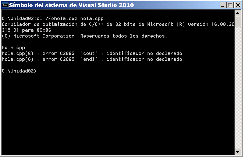 Pero es importante que sepas qué ocurre cuando no todo va bien, cuando cometemos errores de programación. Para comprobar qué hace el compilador de VS2010 cuando encuentra errores, edita el programa (hola.cpp) y: